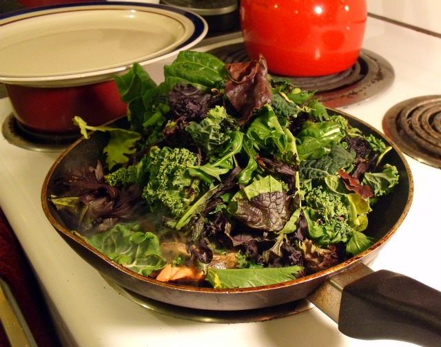 I added a cup of homemade chicken broth, and let that all cook together while I chopped the veggies — not too much, just enough to dot the stew with some tender pieces.