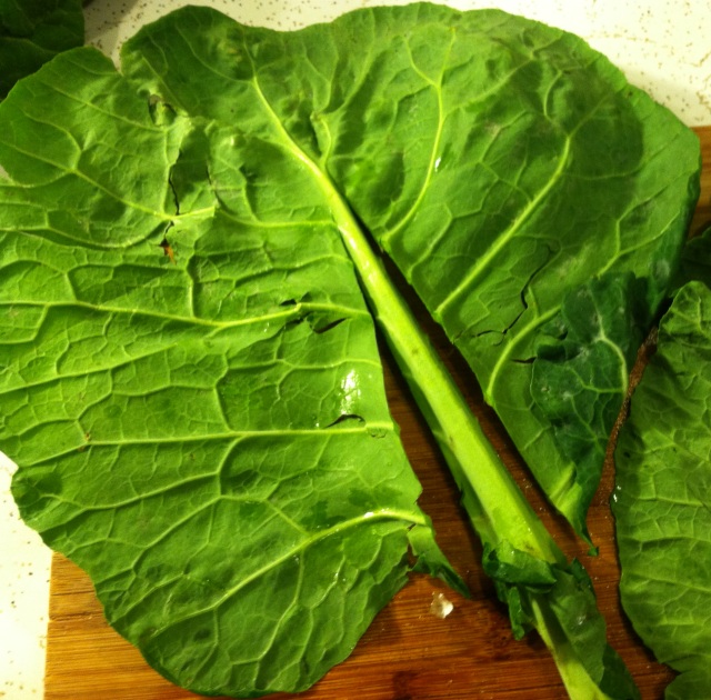 I put the lid on the pan and let this all simmer on medium-low, and in the meantime, chopped up a bunch of collard greens.
