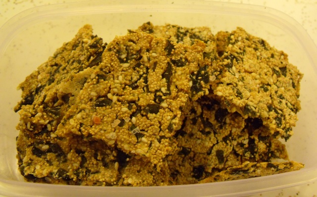 So, faced with a glut of leftover amaranth grains, I decided to try out another go at gluten-free crackers. To start with, I sprouted the amaranth for three days by soaking it in water, draining it in a jar with a mesh top, and then rinsing it daily so the grains stayed moist.