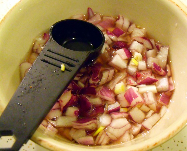 and to that added half a red onion and a couple stalks of celery, both chopped, letting them marinade while I worked on the rest.