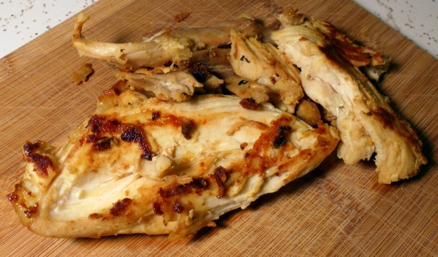 In the past when I’ve made this I’ve bought whole chicken breasts and cubed them, but since it was my day off and I had a few hours of homey stuff to do like laundry and dishes and packing for this weekend, I bought a whole chicken and roasted it, saving portions to be frozen for later in the month, and shredding a good deal of it for tonight.